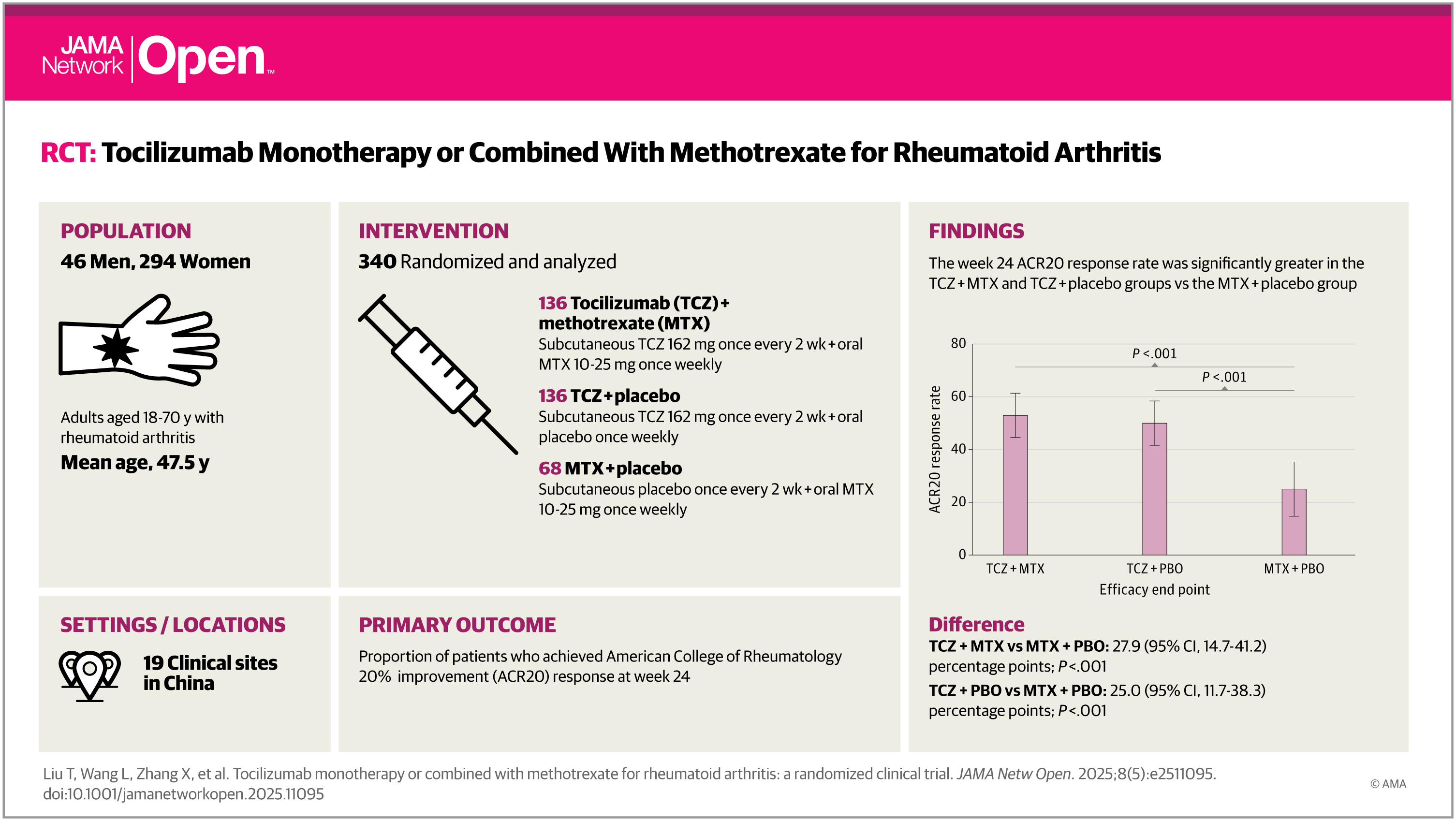 - 方法: 中国国内19施設で実施された第III相二重盲検ランダム化臨床試験。トシリズマブ+MTX、トシリズマブ単剤、MTX単剤の3群を直接比較。